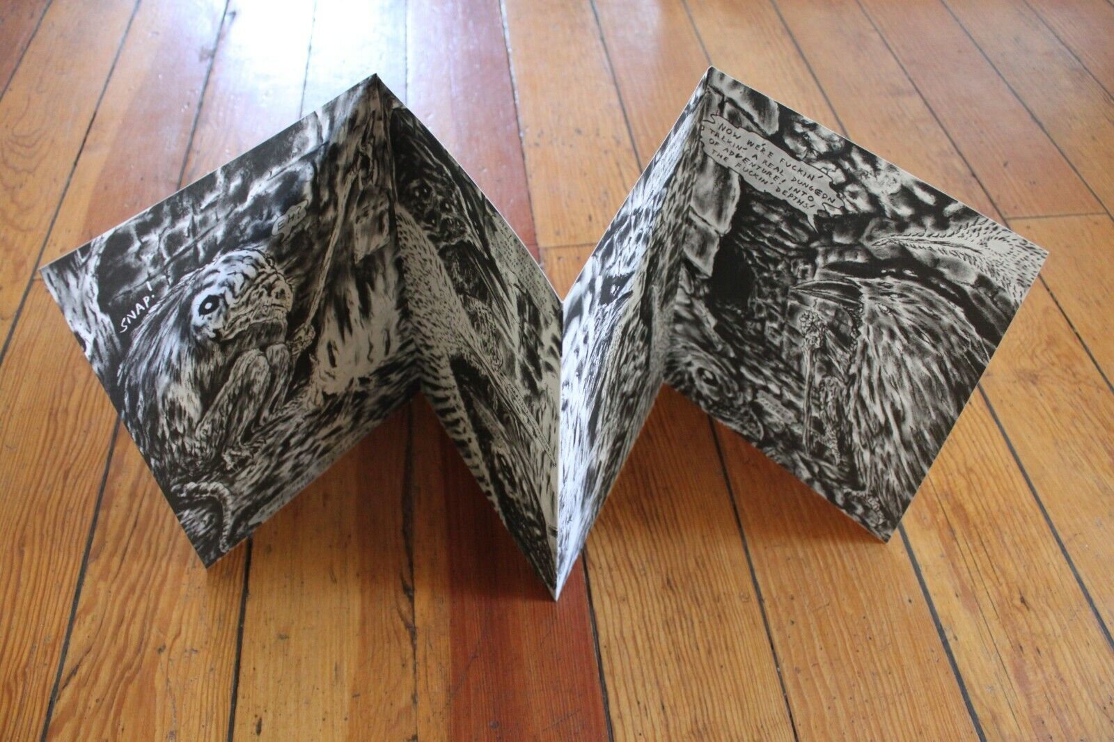 8 pages, 10" x 14" (accordion unfolds to 10" x 40"!). Offset printed with Deep opaque black ink on Ivory paper. First printing, limited edition of 400 copies. $13.00 Cover Price.