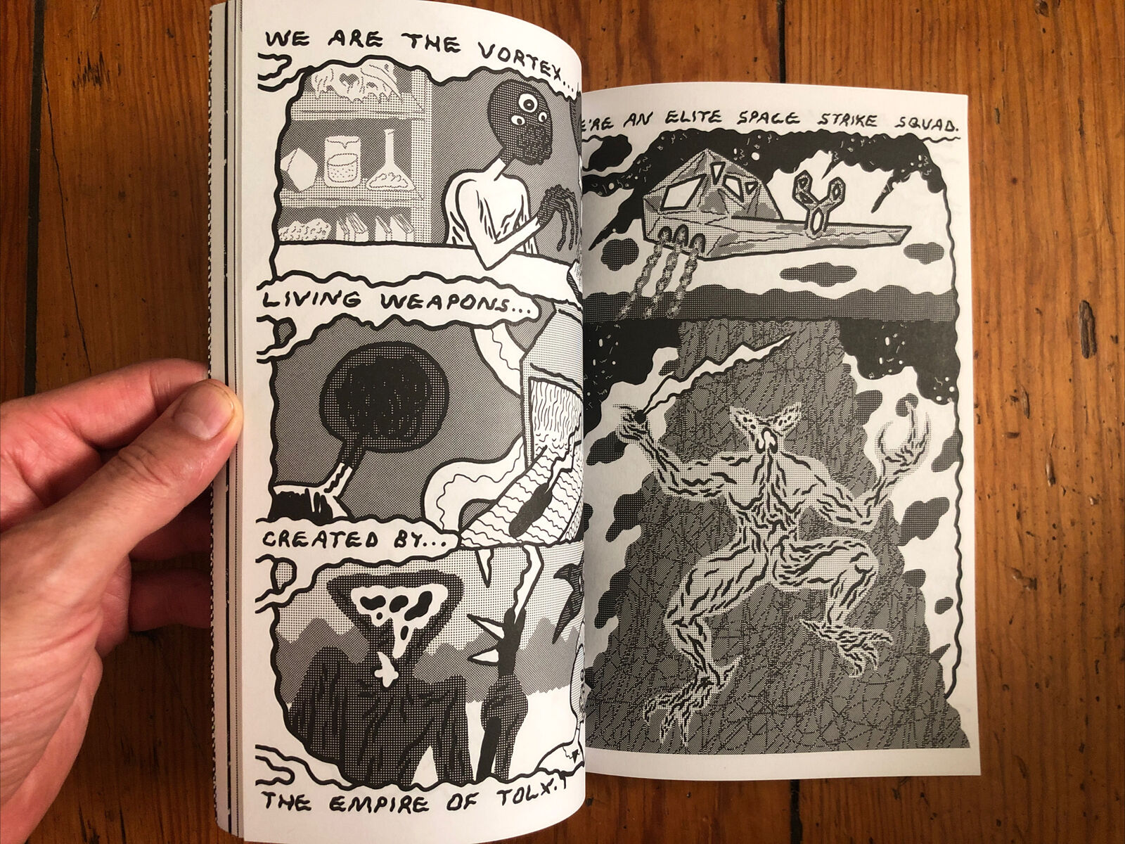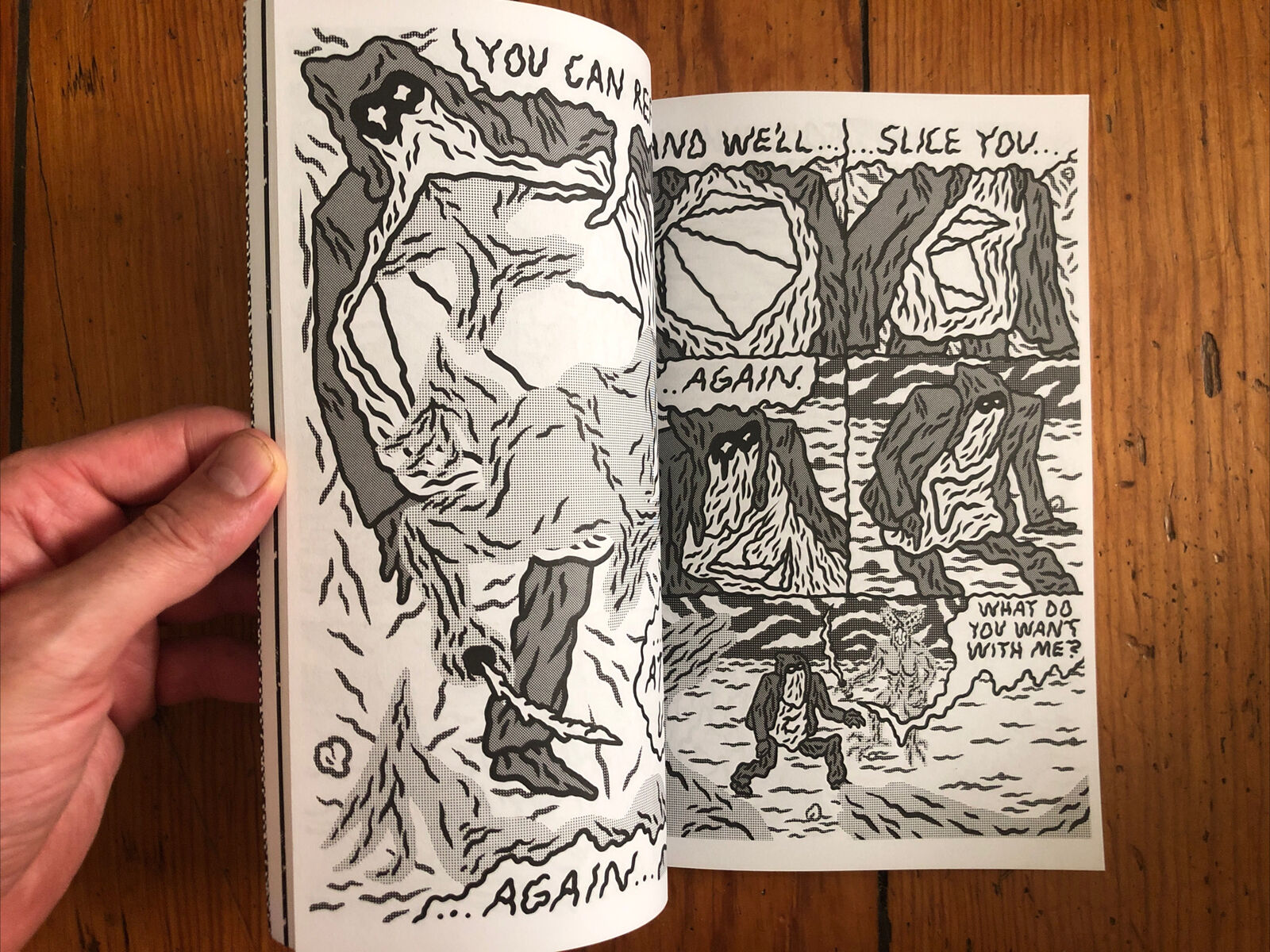 “Goopy alien wizards melt, battle and stab their way from each others’ stomachs in cosmic landscapes forged from bold halftones and thick wacom lines. The contrast between low-res digital textures and organic shapes is a real eyeball melter.” Jack Hayden, Comics Workbook