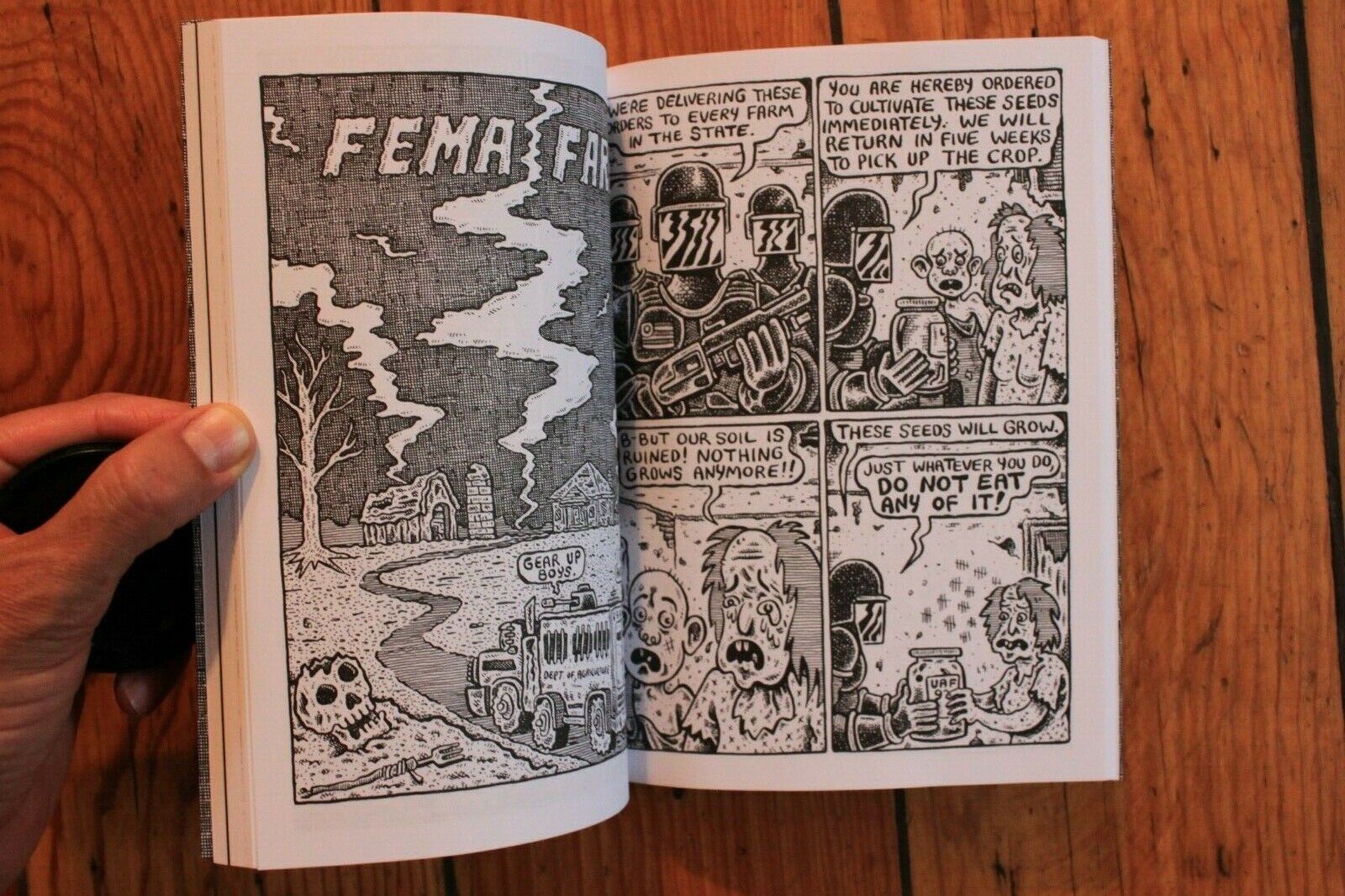 "Max Clotfelter can crank out some pretty d*mn cool comic strips...Clotfelter’s always been wildly inventive, of course, creating comics that bridge the stylistic and thematic gap from old-school undergrounds to present-day “aht comics,” but perusing the contents of his recently-released Rat Tactics ‘zine shows something of a hitherto-unremarked-upon (as far as I know, at any rate) evolution in his work, albeit in severely, wondrously truncated form : the yarns at the start, dating back to 2012, are rough-hewn affairs with little by way of concern for even storytelling basics, much less actual narrative, pesky little concerns like coherence and the confidence attendant with it picking up metaphorical steam as we head toward the book’s 2017 finish line. All points along the trajectory offer their charms, of course, and are worthy of detailed exploration — something of an irony, I suppose, given that slowing down to smell the roses (or, hey, the post-apocalyptic mutant sh*t) isn’t something that the circumstances of these strips’ genesis allowed for — but make no mistake : not everything here, makes “sense,” nor should it...Not to mention everything else that Clotfelter’s work is known for : smart, disturbing, gruesome, frequently unsettling. Whether he’s doing autobio, stuff you hope to God is anything but, or stuff that you d*mn well know absolutely can’t be, there’s no mistaking the deliriously warped sensibilities (and trust me, I mean that as the highest possible compliment), the absurdist humor, the willful disposal of all things “high-brow,” and the dogged tenacity for just drawing the f*ck out of every single page that are our guy Max’s stock in trade. This is dynamic. Visceral. At its best, maybe even combustible..." BY RYAN C. (TRASHFILMGURU).