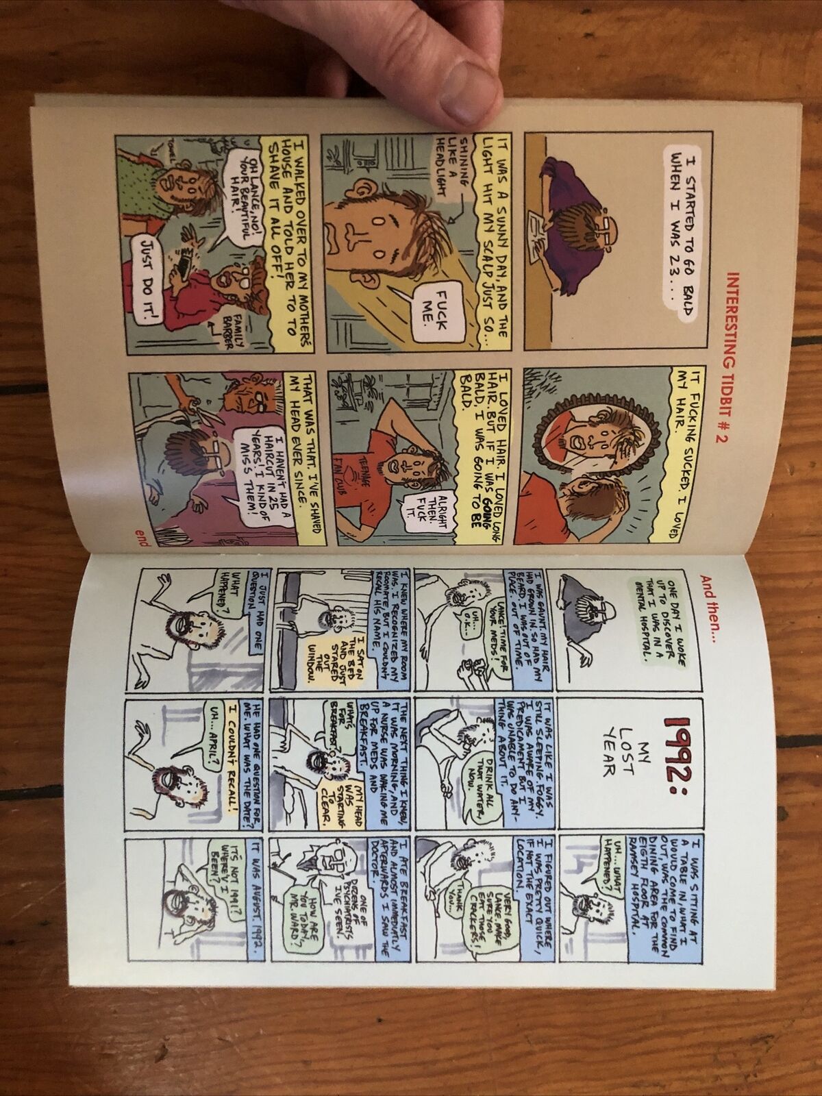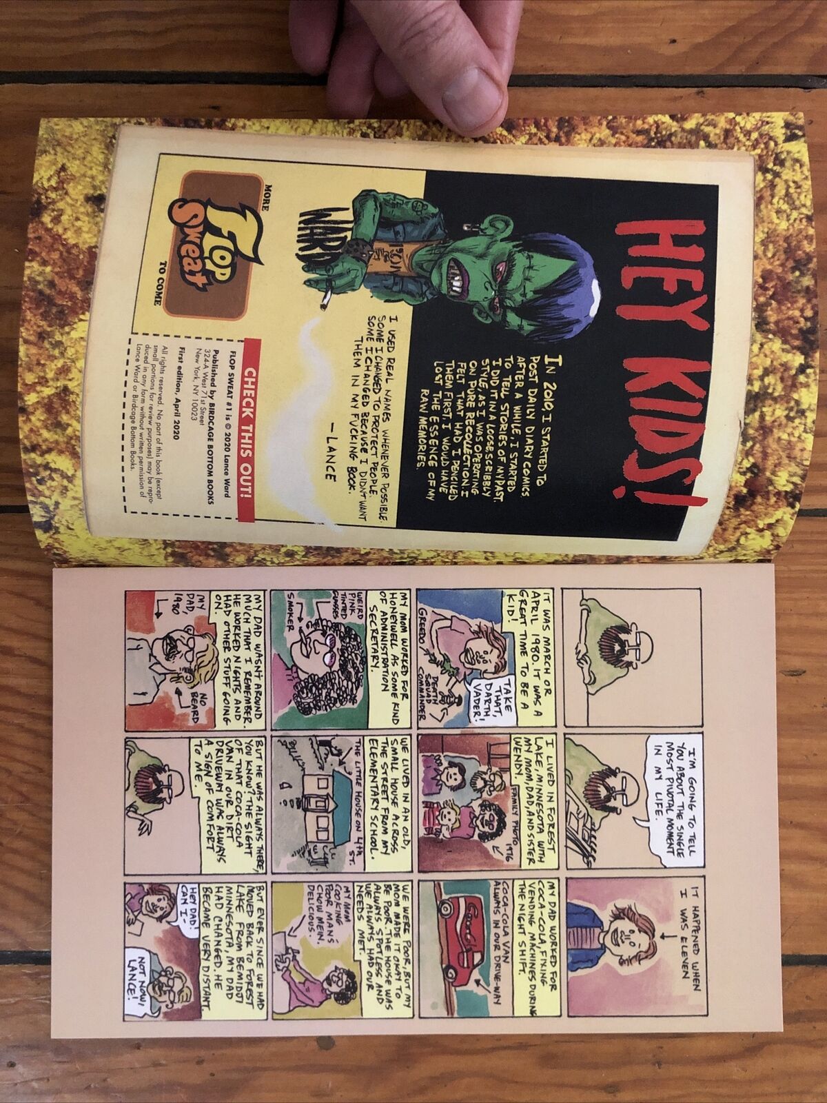 Flop Sweat is an ongoing serialization of Lance Ward’s autobiographical comics arranged chronologically. Previous self-published collections of these comics were featured in The Best American Comics. Ward’s life has been rife with pitfalls: abandonment, addiction, mental illness, s*xual assault, arrest, attempted suicide, and even a death experience (not “near-death”, he was clinically deceased!). Yet, through it all he has somehow maintained a positivity about and loyalty to his art, even after crushing his drawing hand!