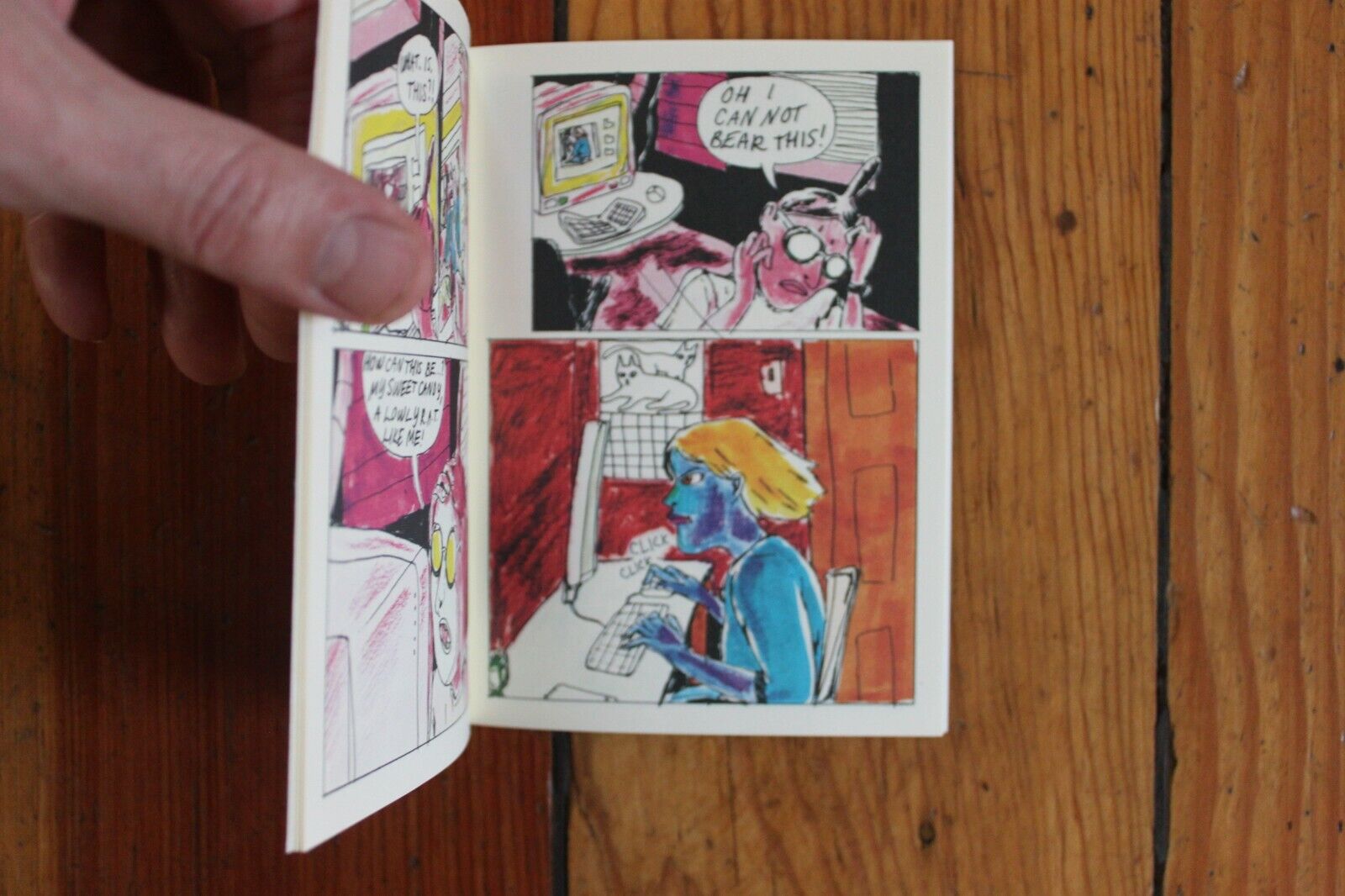 Candy’s computer has a R.A.T. aboard –a Remote Administration Tool, through which a stranger watches her via the internet. But who’s watching who? 28 pages, 4″ x 5.75″, full color throughout. (KUŠ)