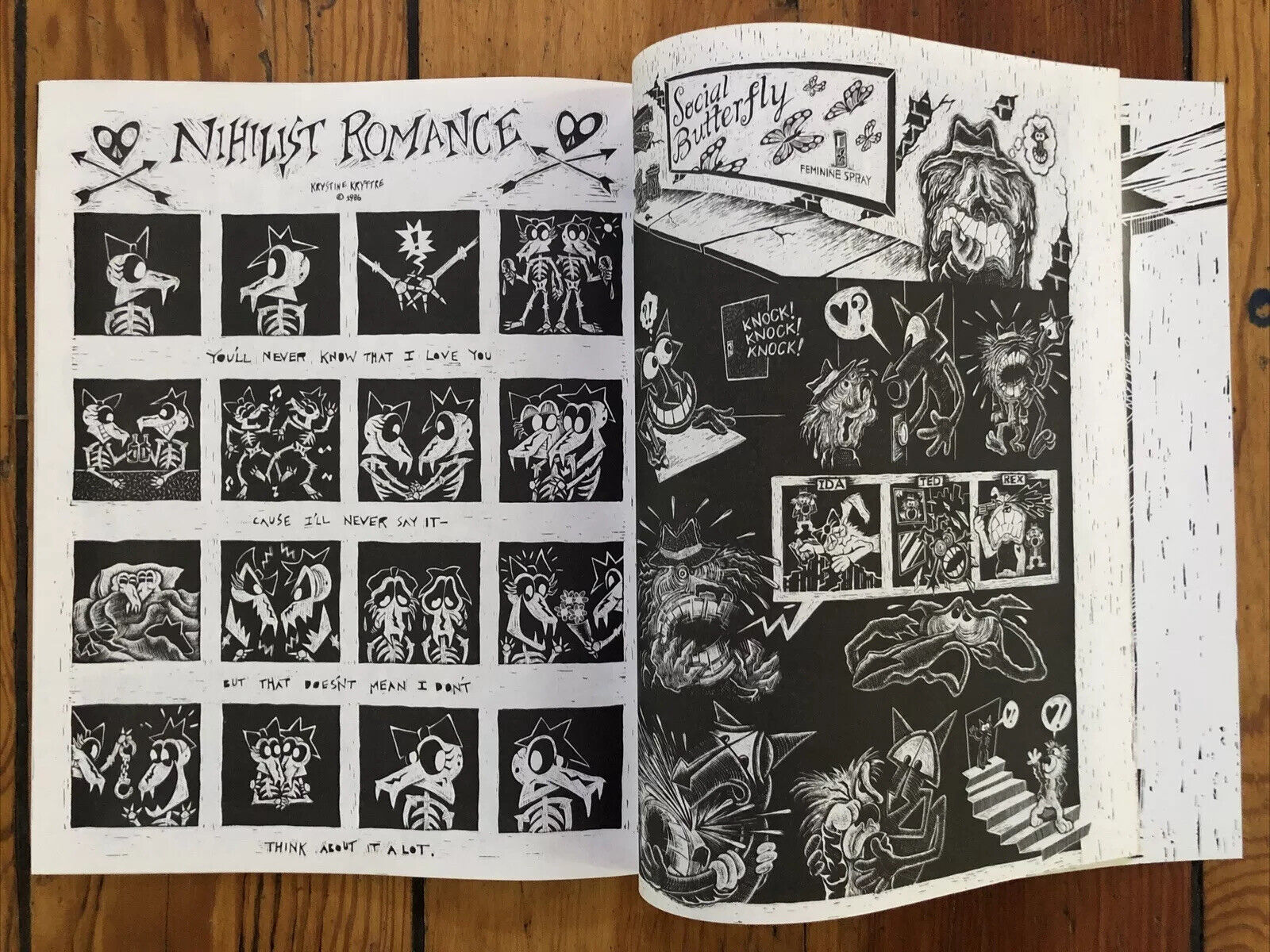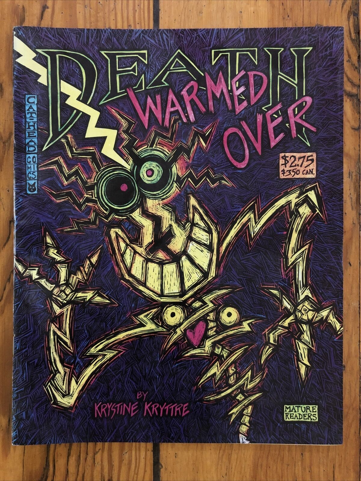 Vibrant, angular, New Wave ferocity is found in Krystine Kryttre's solo comic, Death Warmed Over. Bold graphic style, punk rock mess-making, emotional train-rides! Printed in 1987.