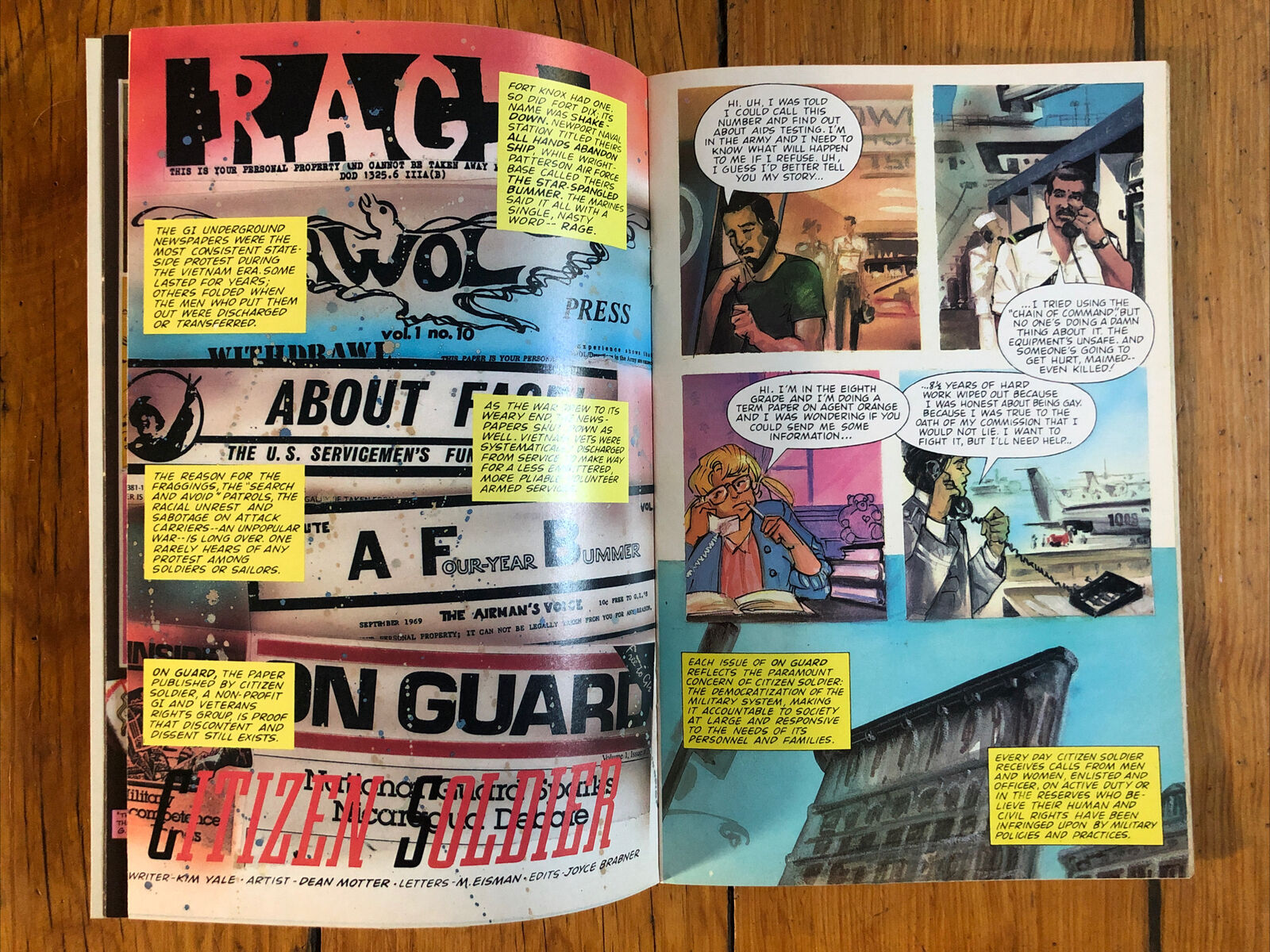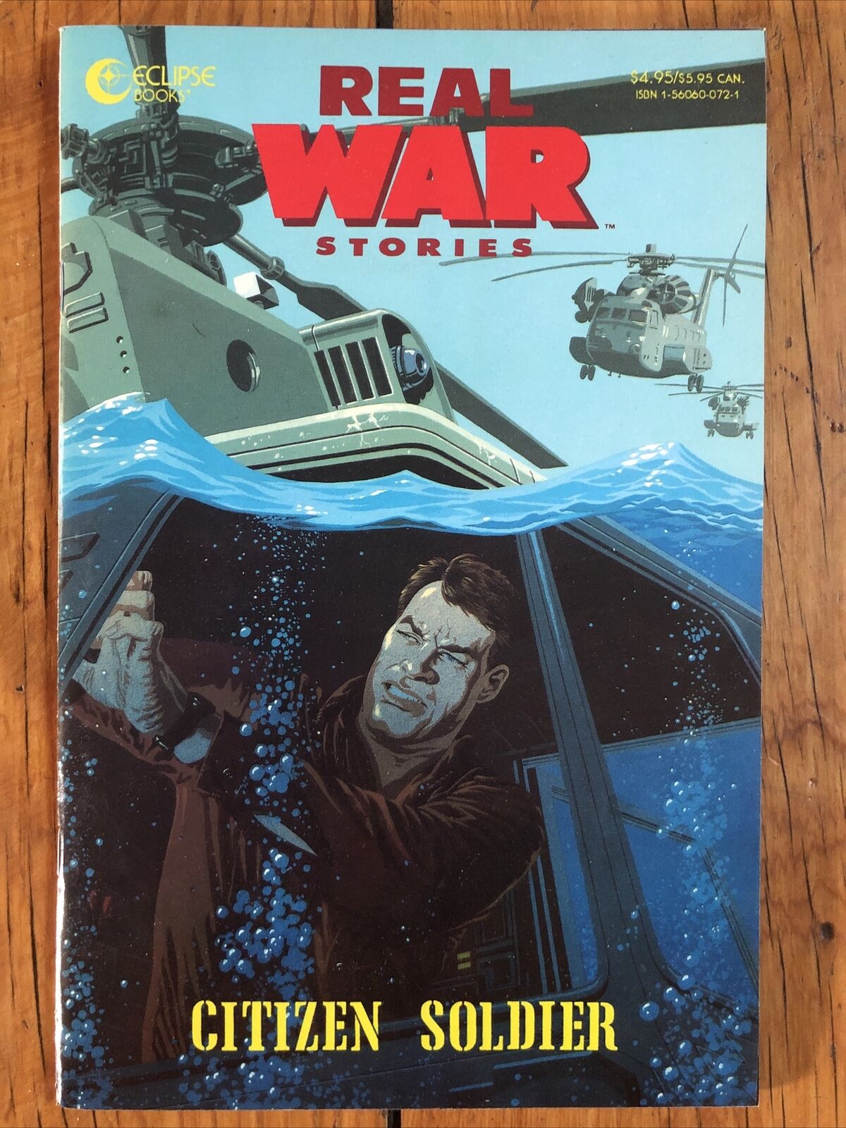 True tales of combat by veterans, as told by top comics talent. Body Washing, written by Paul Naureckas with art by Bill Sienkiewicz; War Is a Racket, written by Gen. Smedley Butler and Joyce Brabner with art by Wayne Van Sant; Citizen Soldier written by Kim Yale with art by Dean Motter; Pool of Tears written by Greg Baisden with art by Stephen Destefano; The Home Treatment written by Brabner with art by Dennis Francis; My Father and His Son written by Mike W. Barr with art by Mike Badger. Additional articles by Tod Ensign of the vets group Citizen Soldier. Back cover: Whats Wrong with This Picture? by Paul Mavrides. Cover by Paul Gulacy. Mature readers. 48 pages. Full Color throughout.