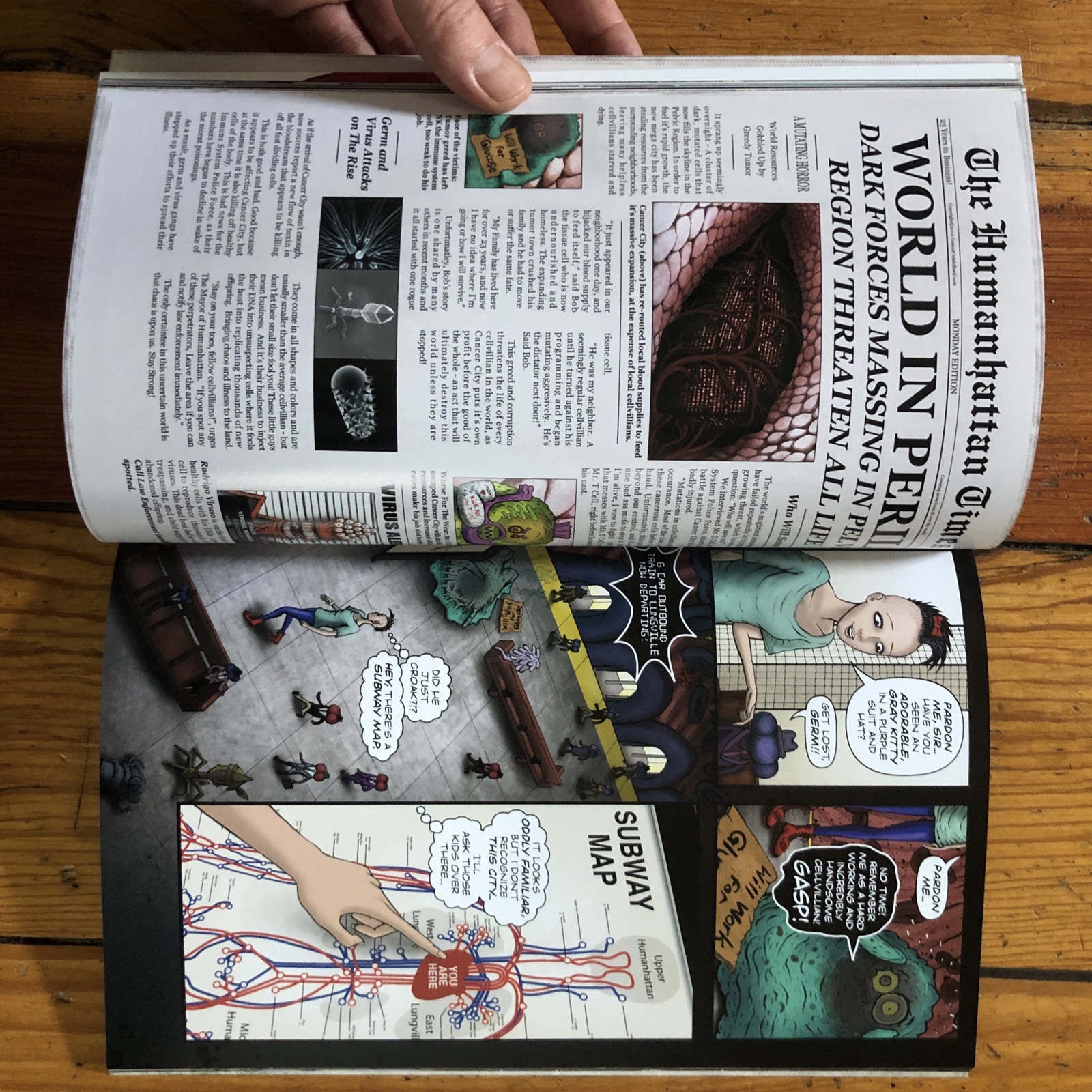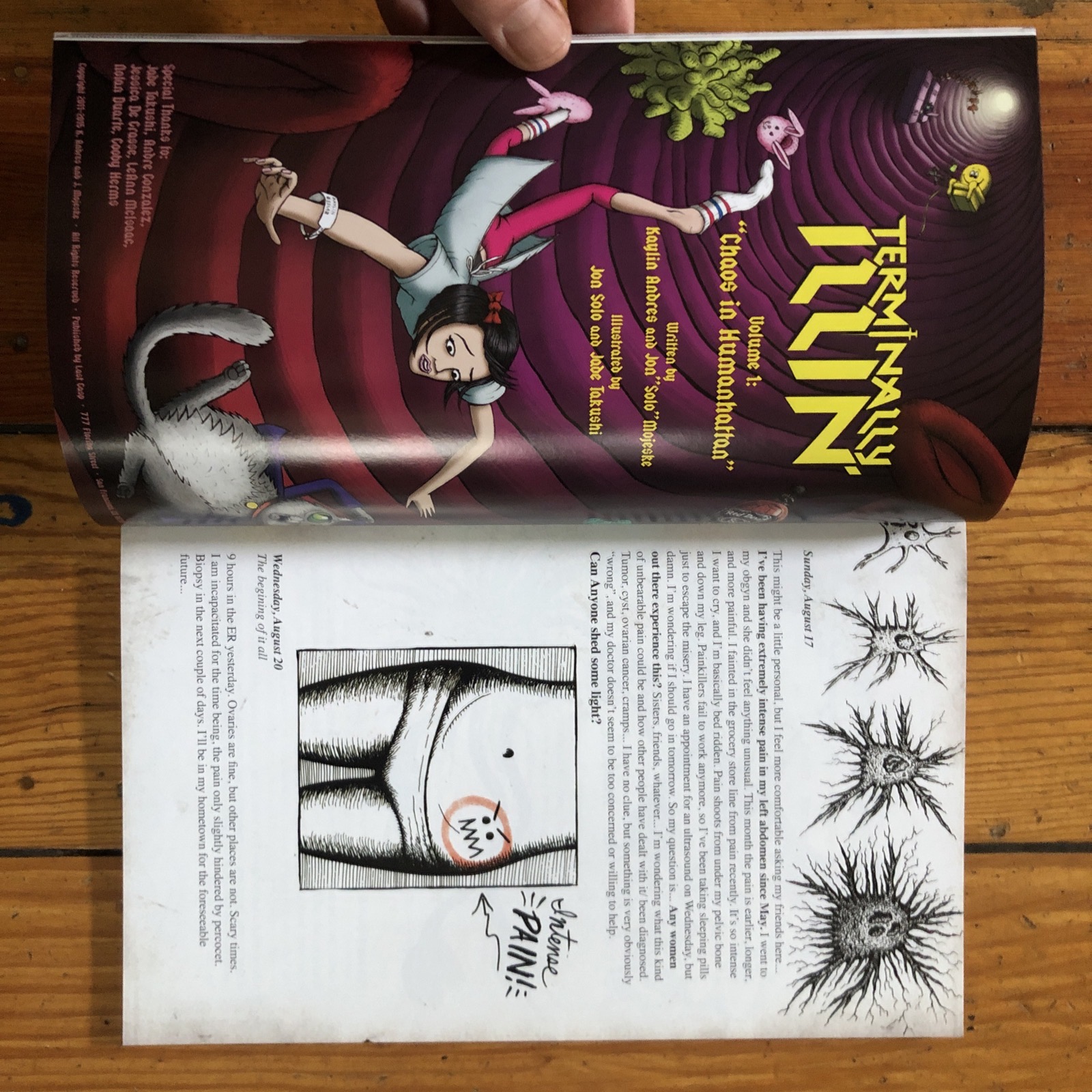 Terminally Illin' is a collection of comics written during a 23 year old girl's battle with a rare bone cancer. When fashion student Kaylin Andres was diagnosed with Ewing's Sarcoma, her career ambitions went on hold and she reluctantly began a new journey. In the face of this new threat she found strength in humor and imagination, and that's how this book came to be. With an overwhelming desire to meet her disease face-to-face and kick's butt, she takes a magical journey into her own microscopic body on a mission.