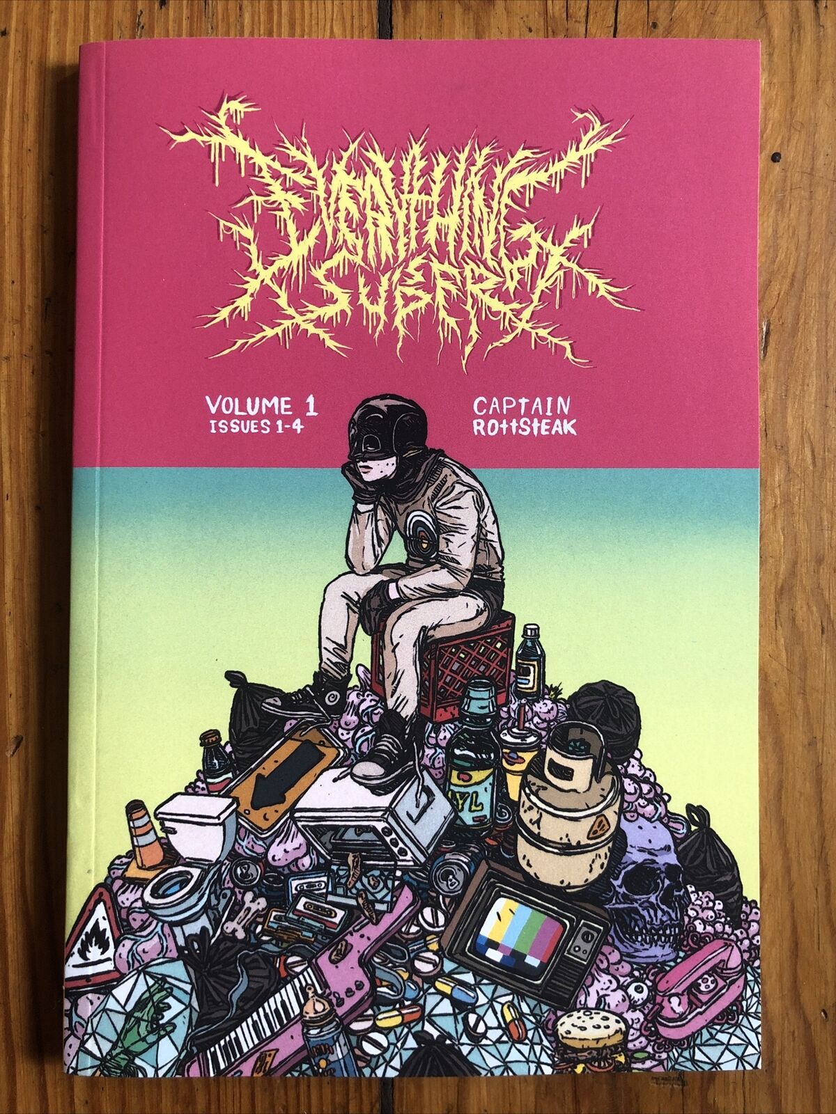 "Everything is Super follows the misadventures of Lloyd the Human Hemorrhoid Herman as he stumbles through contemporary life in a dead end, backwater superhero town. Volume one collects issues one through four. Recommended for mature audiences."