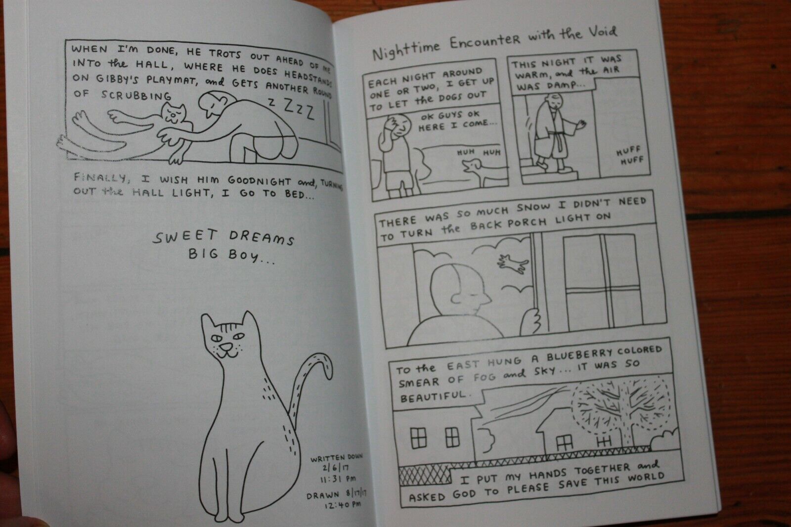 Porcellino is always sincere in his observations. It's just that sometimes he's sincerely silly, like when he dropped a bunch of corny jokes as part of his illustrated Nature Notes. There's another making of strip, this time of another cat, Michi. In the original strip, Porcellino says to her, "You look like a possum". The cat replies, "Good, because I want to look like a possum", which is a very Zen and cat-like thing to say. The making of strip reveals Porcellino's imagination as he saw her eat. There's alsoa a goofy drawing of him, half-asleep, talking to his dogs as he wake up to feed them.