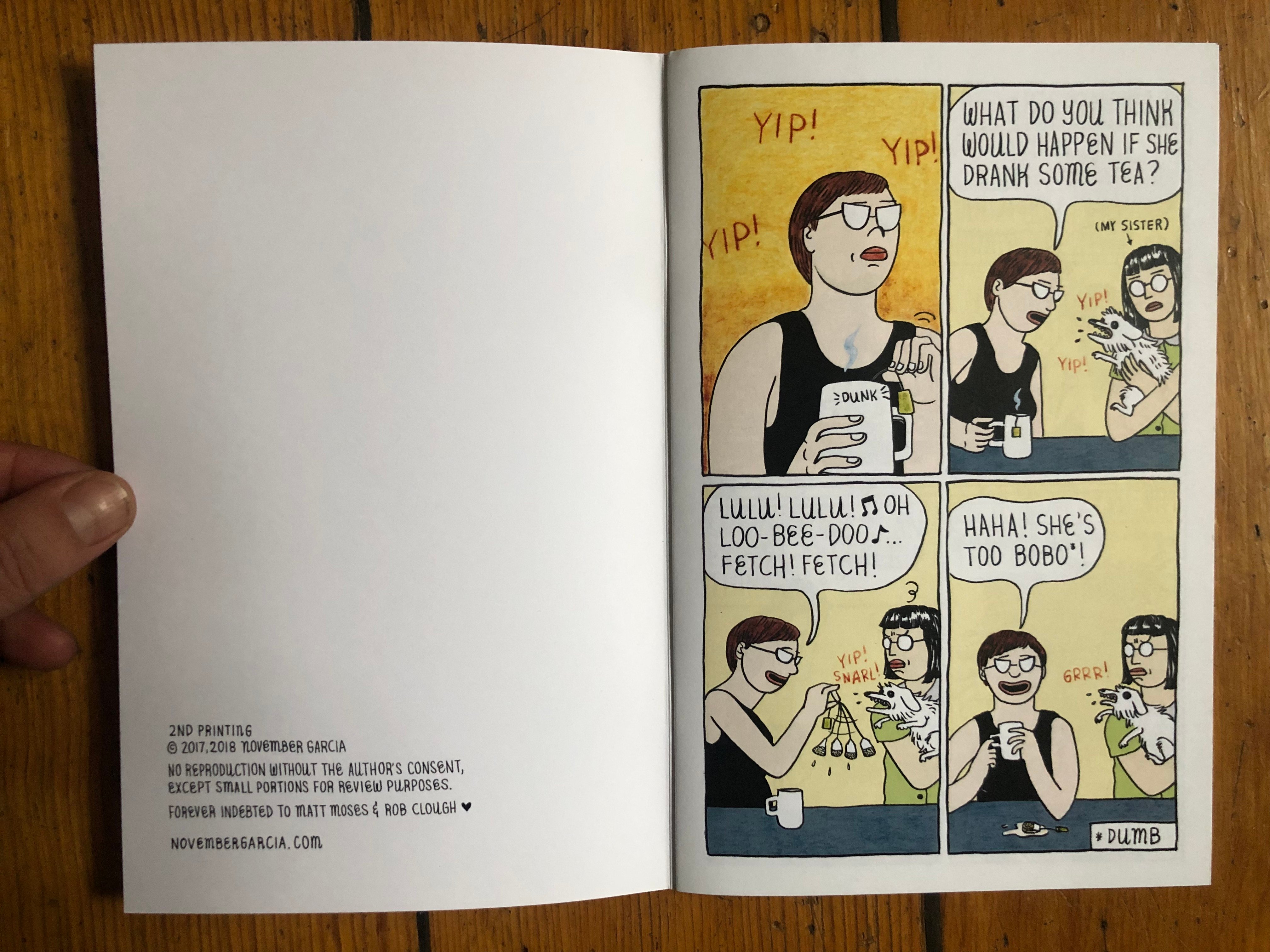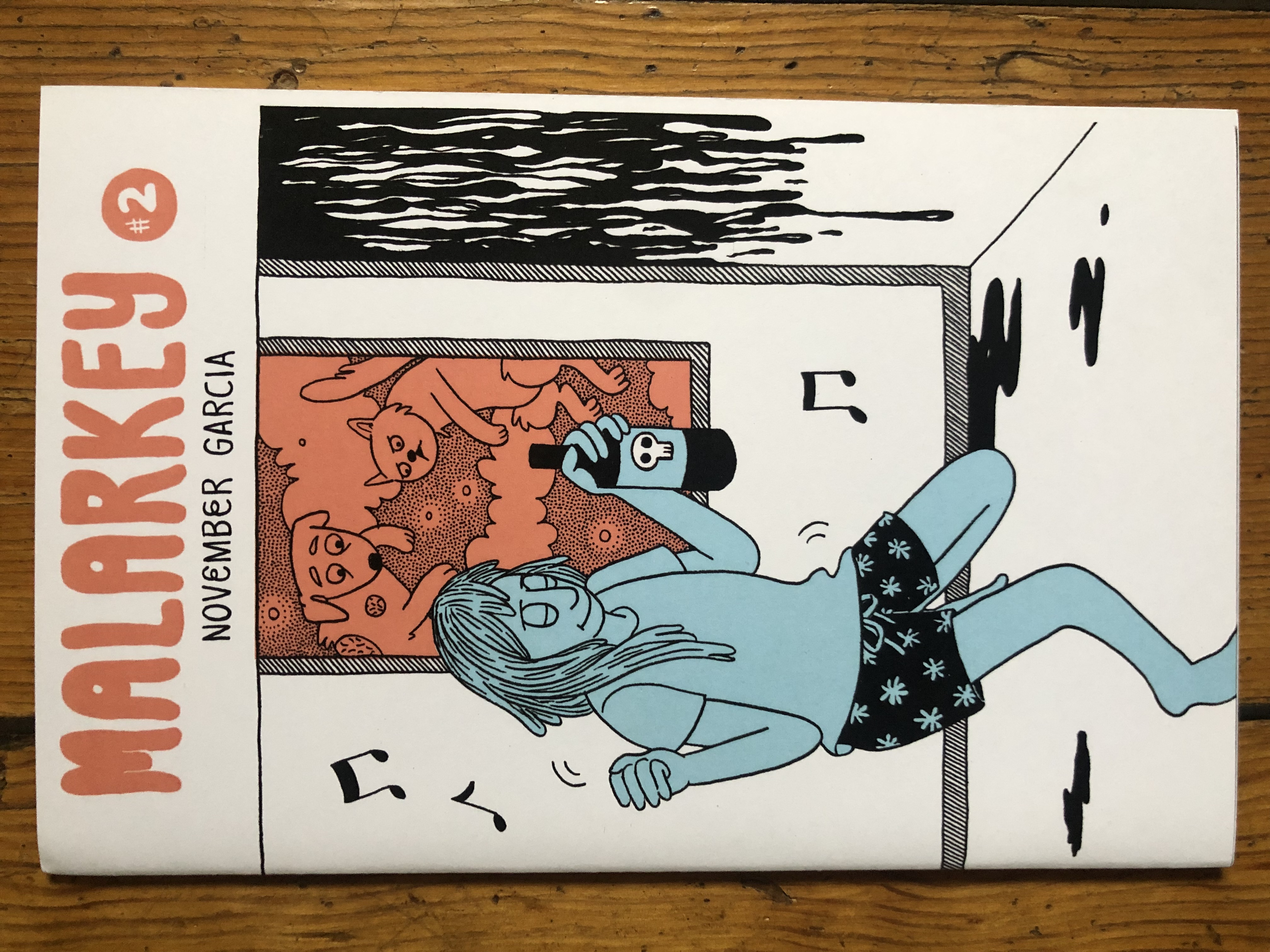 Issue #2: Malarkey collects November Garcia’s great self-deprecating autobio comics, in which she navigates goofy humor and real emotion with equal aplomb. This issue features short stories as diverse as drug-fueled art antics, drunken inking, Comix Fantasies, Oh Mom! and lots more. Charming and fun. 5.5" x 8.5", 24 pages. $5. Full-color covers and interior.