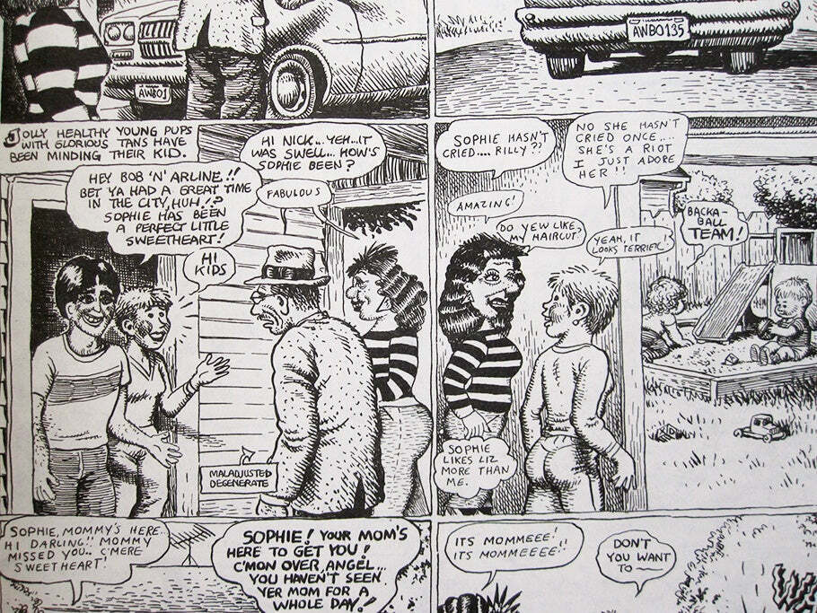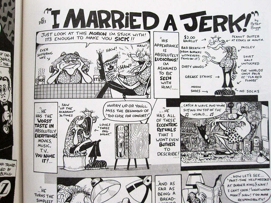 Cover by Robert Crumb. "Elf Squelch," script by Jane King and J.D. King, art by J.D. King; a parody of ElfQuest. "Arline 'n' Bob and That Thing In the Bedroom," script and art by Robert Crumb and Aline Kominsky-Crumb; The trials of having an infant child. "Mission Nites," script and art by Spain Rodriguez; Big B*tch is on Trashman's trail. "Cockroach Crisis," script and art by B.N. Duncan; Hannah ponders the sanctity of life. Six illustrations by Max Crumb. "I Married A Jerk," script and art by Peter Bagge; The faults of a geek husband. "The Artist Meets a Swinger or... Crabs Eating Raoul," script and art by Dori Seda; Dori's experience with swingers. "Cave Nudes," script and art by John Kricfalusi (as Billy Bunting); Flintstones parody. "Modern Boy," script and art by Dave Geary; The modern boy rails against society. 44 pgs., B&W. 8" x 11" $2.50. Cover price